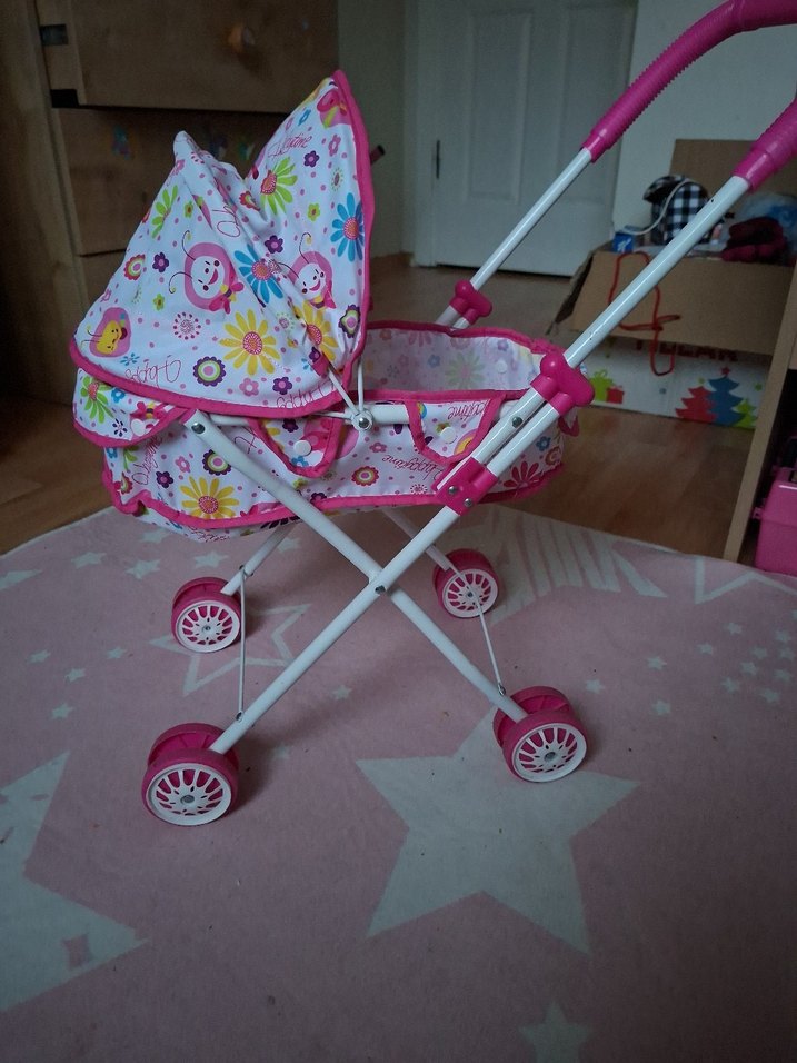 Pembe renkli ve çiçek desenli tenteye sahip renkli bebek arabası. Dört tekerlekli, hafif ve kolay kullanılabilir.