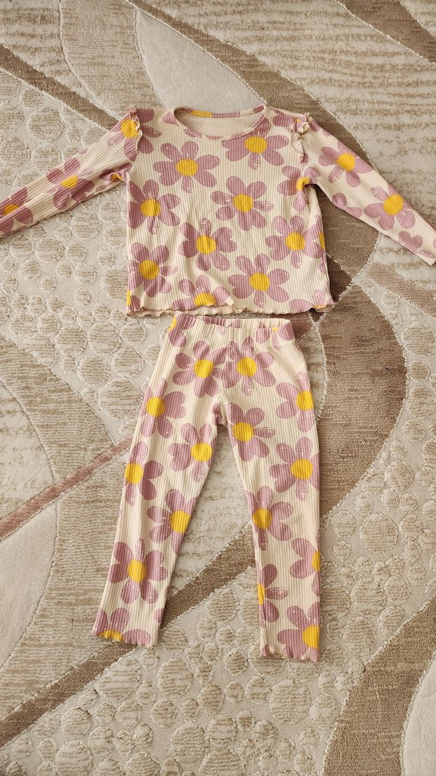 Pastel pembe renkli bebek kız takımı, uzun kollu üst ve çiçek desenli pantolondan oluşur. 4 yasa uygundur 1 sezon kullanildi