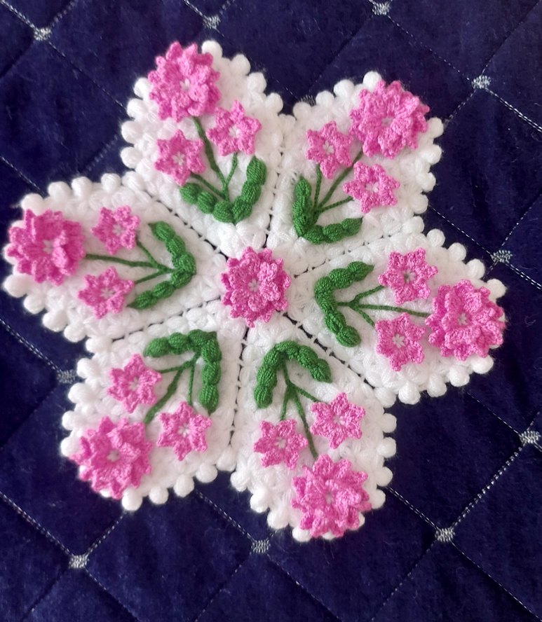 Pembe çiçekler ve yeşil yapraklarla süslenmiş, beyaz el örgüsü banyo lifi Geleneksel tarzda hazırlanmıştır.