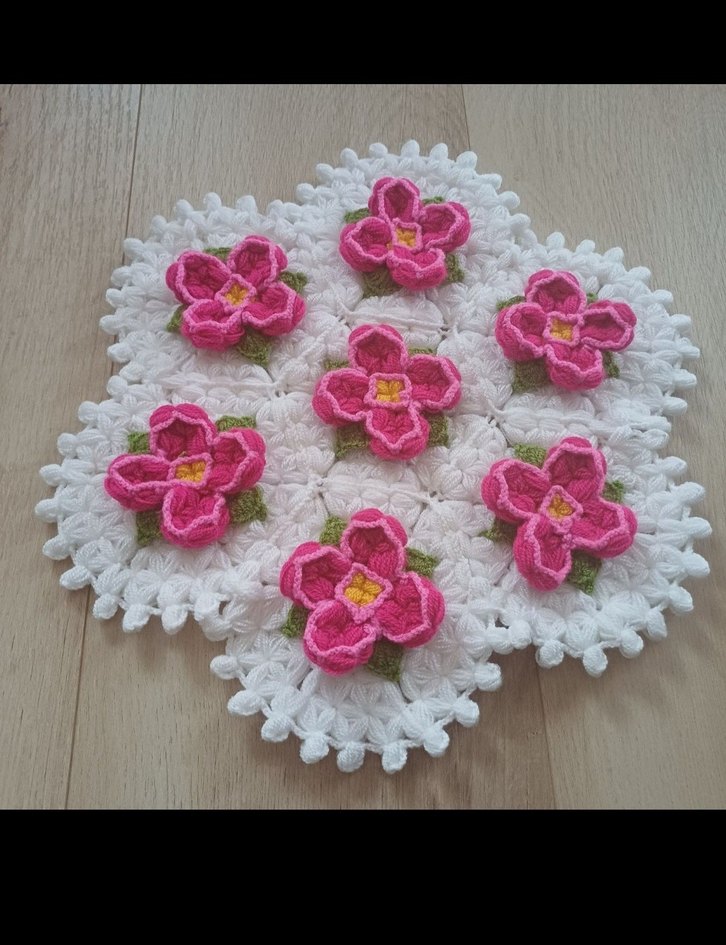 Pembe çiçek detaylarıyla süslenmiş beyaz el örgüsü banyo lifi