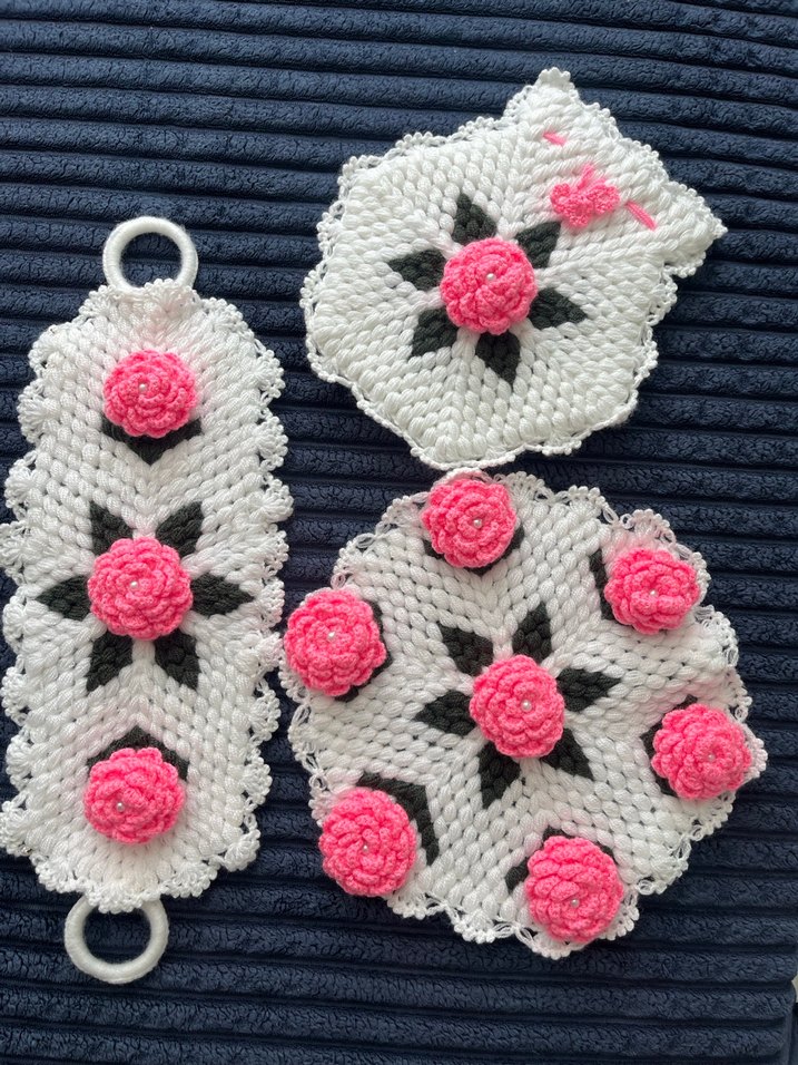 Üç parçadan oluşan beyaz örgü el sanatları seti, pembe tığ işi çiçekler ve haki yeşili yaprak desenleriyle süslenmiştir.
