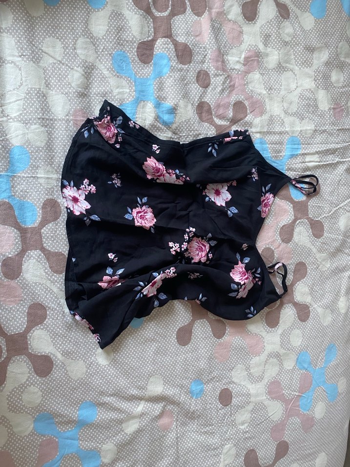 Karanlık zemin üzerinde pembe çiçek desenleri ve zarif fırfır detayları bulunan askılı