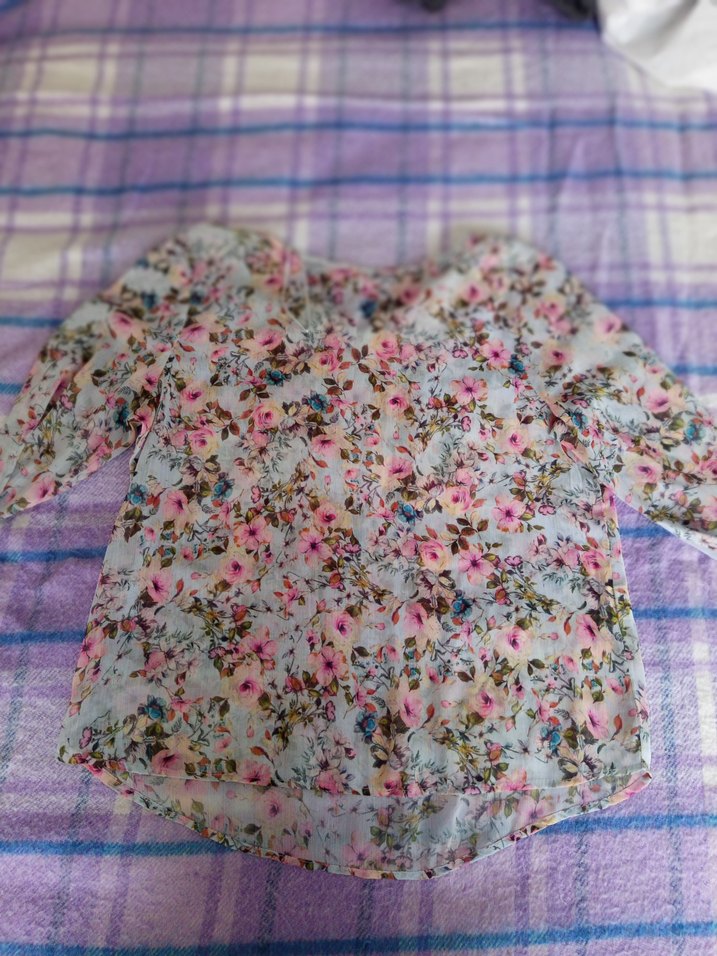 Pembe tonlarında çiçek desenli, V yakalı, uzun kollu ve düğmeli, bol kesim bohem kız bluzu.