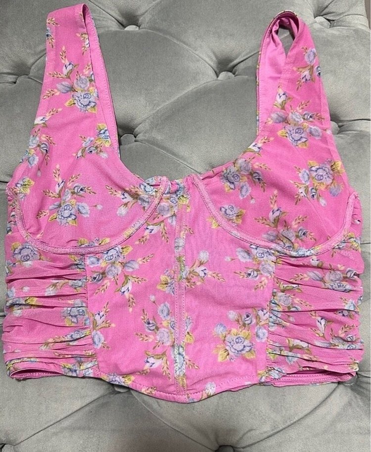 V yaka ve ince askılı, pembe renkli, çiçek desenli ve fırfırlı detaylara sahip mini bohem büstiyer.