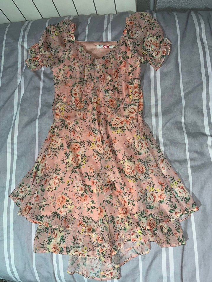 Bu bol kesim mini elbise, kısa kollu ve straplez yakalıdır, fırfır detaylara sahiptir. Yumuşak sentetik kumaştan yapılmış olup, pastel pembe tie-dye çiçek desenine sahiptir.