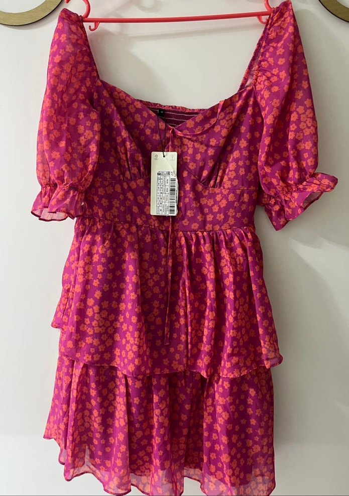 Pembe renkli, çiçek desenli, straplez yaka ve askılı kollu, bol kesim midi elbise. Romantik gece için ideal, fırfırlı bohem tarz.