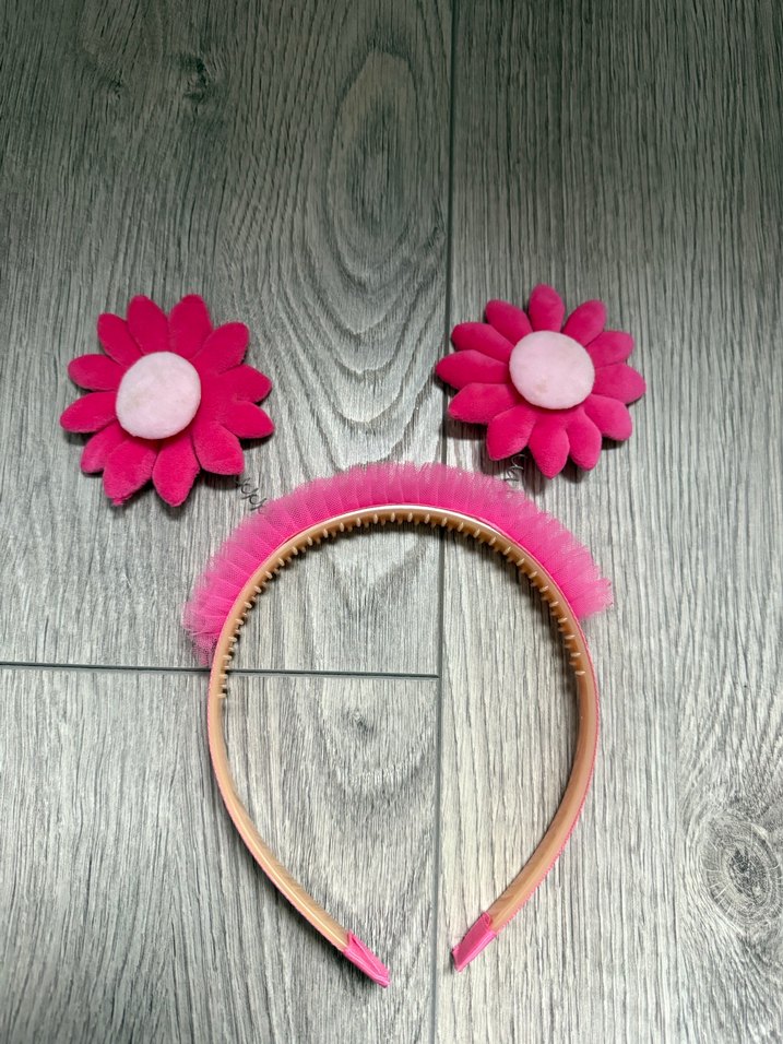 Pembe yumuşak fiyonk detaylı saç bandı ve iki çiçek desenli toka seti, bohem tarz için uygundur.