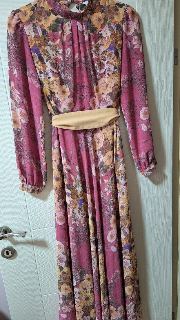 Yumuşak sentetik kumaştan, kloş kesim, pembe pastel çiçek desenli, bohem tarzda uzun elbise. boyun kısmı drapeli ve yüksek yakalı, günlük kullanıma uygun. seyyar kuşaklı Boyu 1.45 civarı