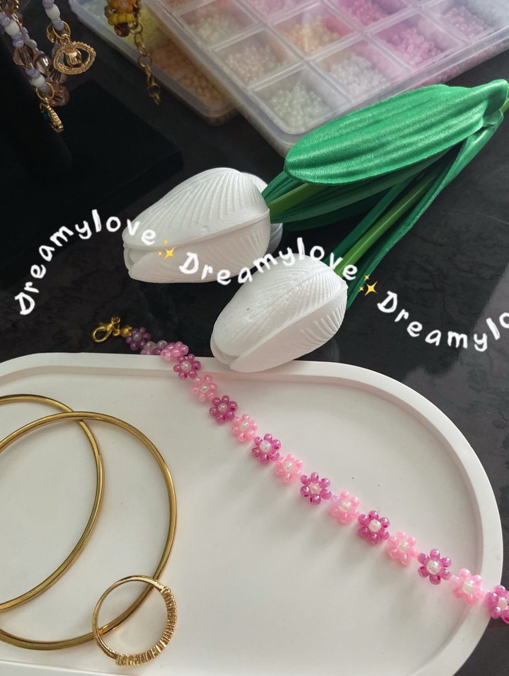 Pastel pembe renkte, çiçek desenli boncuklardan oluşan bohem tarzda, günlük kullanıma uygun minimalist bileklik.