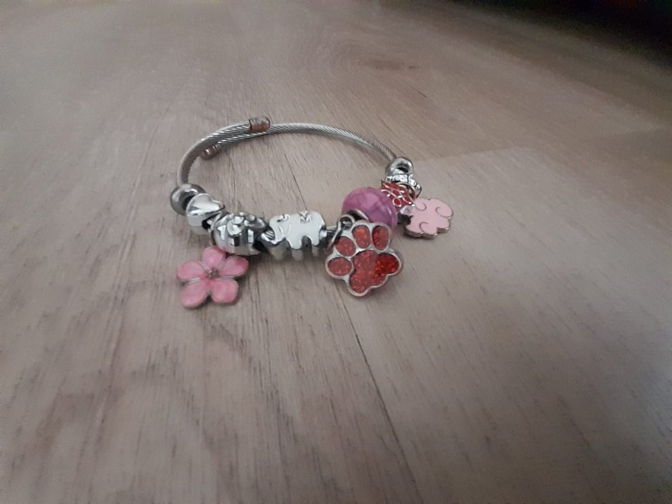 Pembe tonlarda renkli boncuklar ve çiçek figürlü detaylar içeren bohem tarzda kadın bileklik.