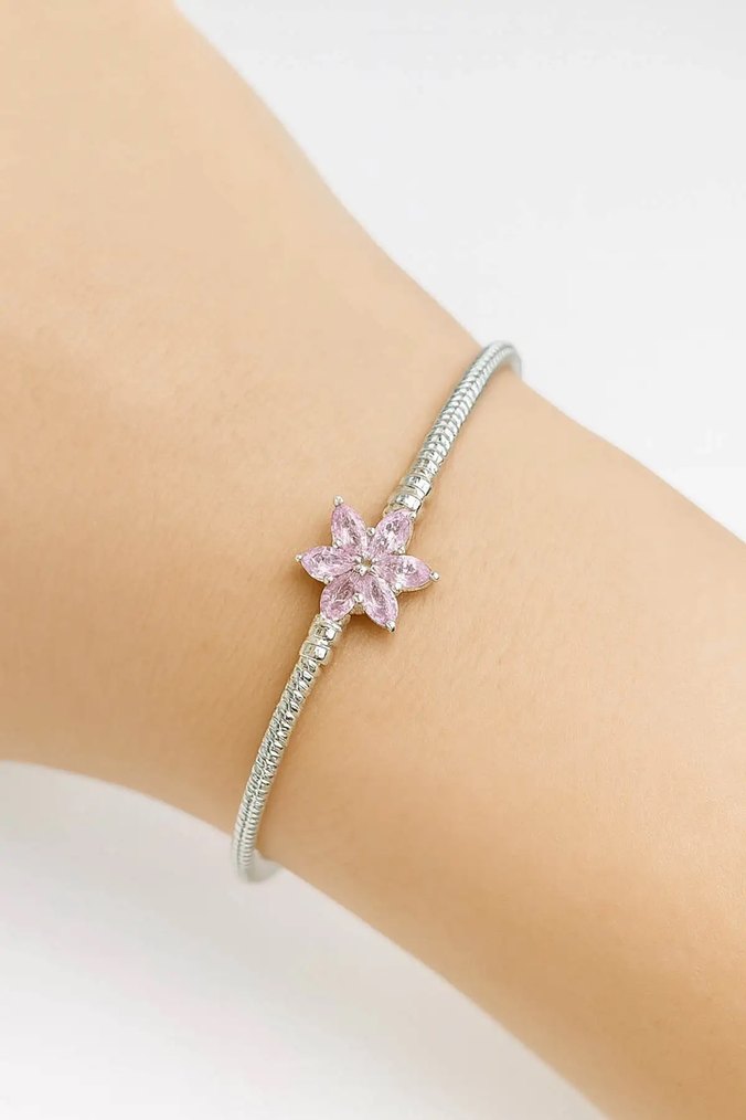 Pembe çiçek figürlü boncuklu kadın bileklik, minimal ve bohem tarzı yansıtarak günlük kullanıma uygundur.