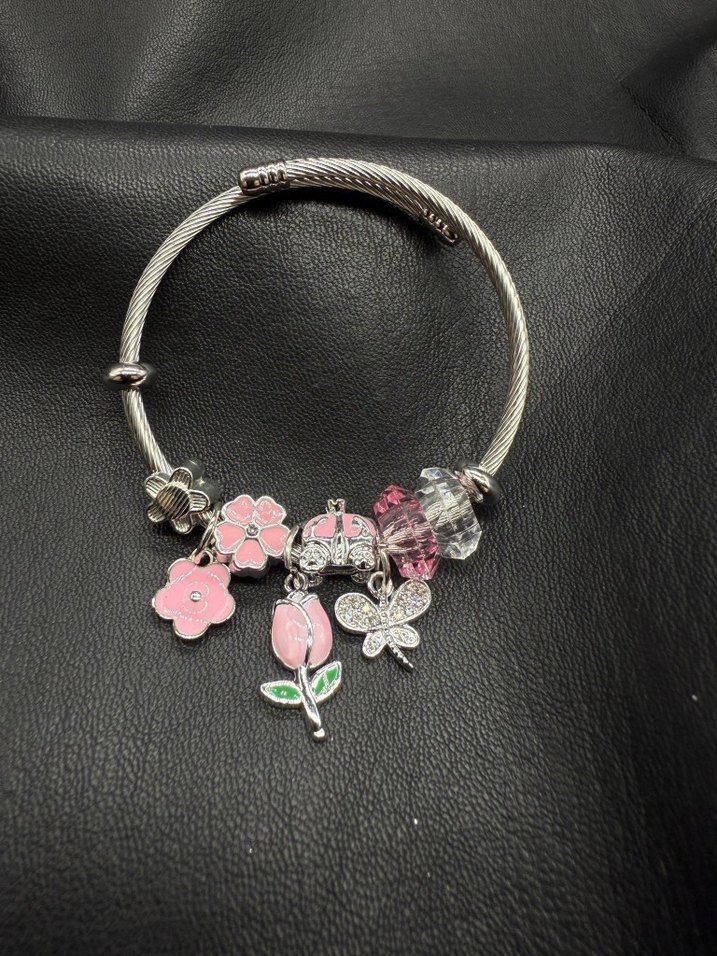 Pastel pembe çiçek ve uğurböceği figürlü boncuklarla süslenmiş bohem tarzda kadın bileklik.