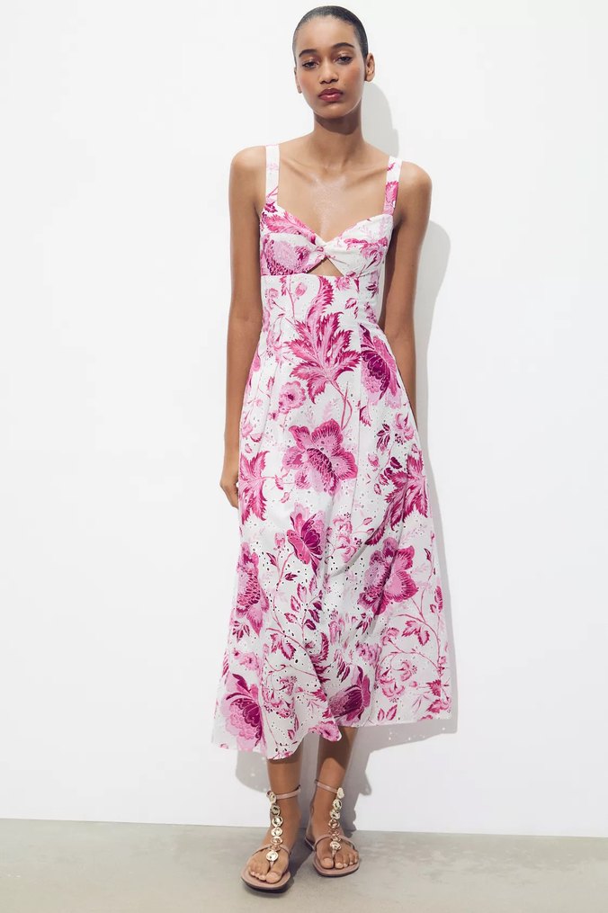 Askılı, çiçek desenli ve dantel detaylı pembe uzun elbise. Bohem tarzda, rahat kesim, romantik akşamlar için uygun.