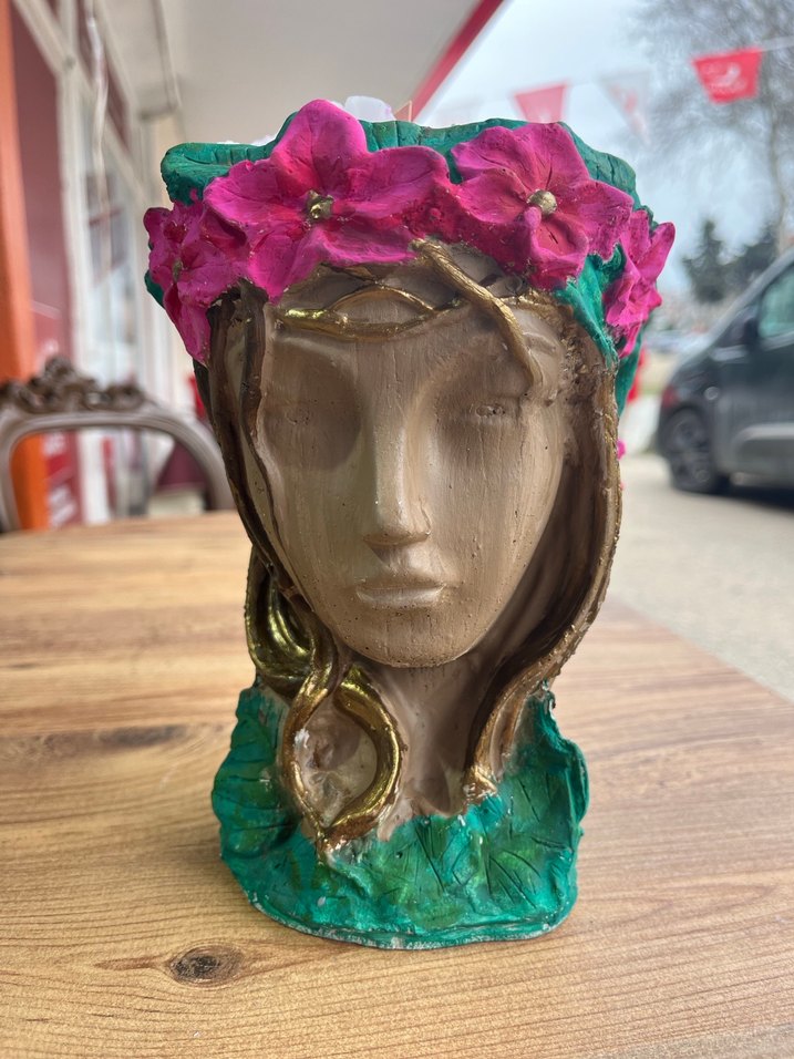 Parlak pembe çiçek detaylı, yeşil ve altın tonlarında süslemeye sahip kadın yüzlü saksı içerisinde gül aromalı mum vardır