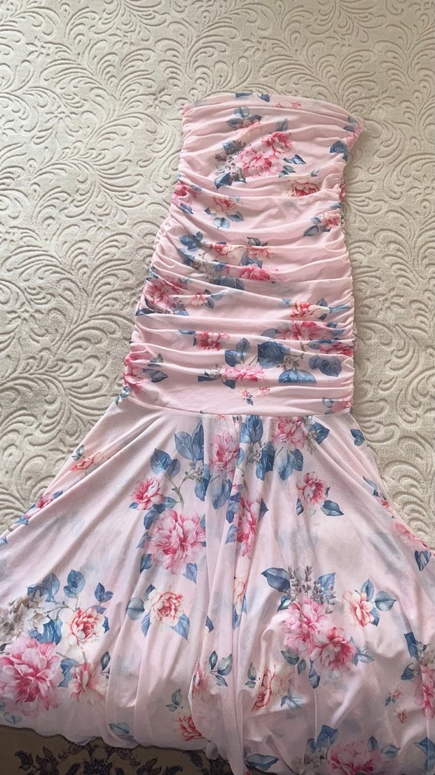 Pembe Çiçekli Drapeli Uzun Askısız Kadın Elbise