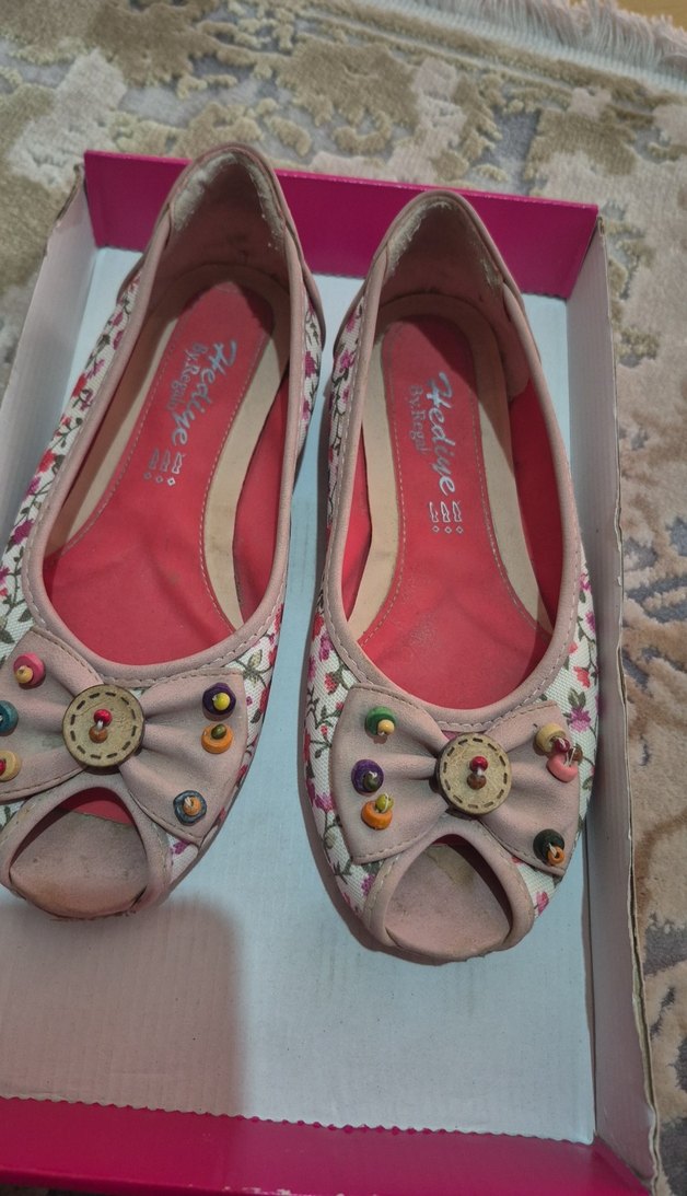 Pembe çiçek desenli, düğmeli dolgu topuklu kız çocuk babetler. Pastel renkte, vintage bohem tarzında, günlük kullanım için uygun. 1 -2kez giyildi.Giyilmediği için uzun zamandır kutuda duruyor.