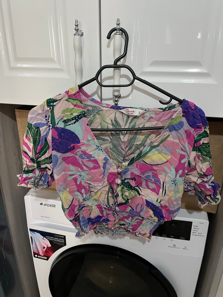 Pembe Çiçekli Düğmeli Kısa Bluz