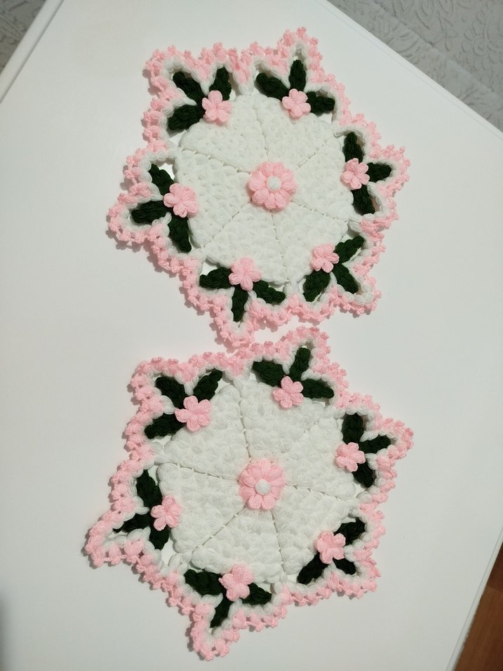 Pembe Çiçekli El Örgüsü Dekoratif İki Parça Set
