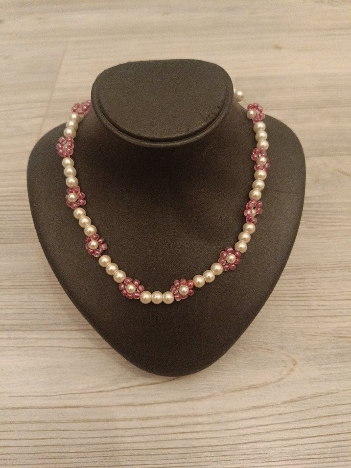 Pembe işlemeli çiçek şeklinde boncuklar ve inci görünümlü boncuklardan oluşan vintage kolye. Ürün El Yapımıdır
