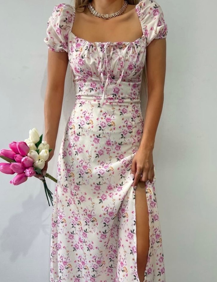 Pembe çiçek desenli , uzun ve yırtmaçlı,vücuda oturan elbise isteyene fotoğrafını çekip atabilirim.