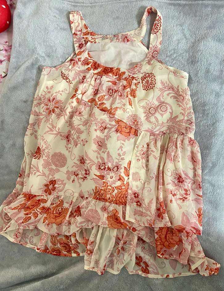 Pamuklu yumuşak dokulu, askılı, uçuş uçuş, bol kesim, pembe pastel çiçek desenli, fırfırlı bluz. Pembe Turuncu Desenli Bohem Bluz. Eteği fırfırlı, askılı bohem bluz. Pembe turuncu çiçek desenleri var.