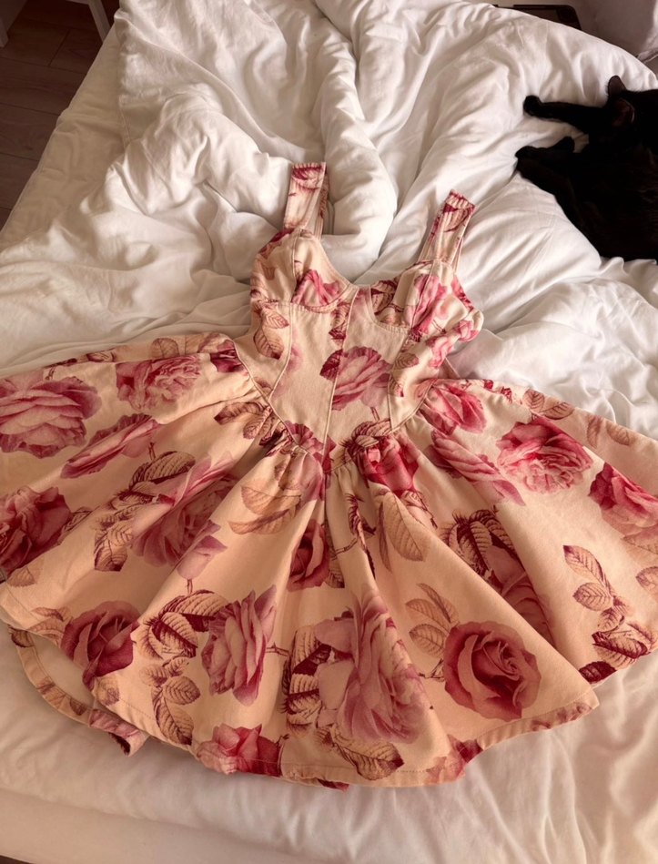 Pembe pastel çiçek desenli, straplez yaka ve fırfır detaylı, vücuda oturan midi boy elbisedir. Yumuşak sentetik kumaştan yapılmıştır.