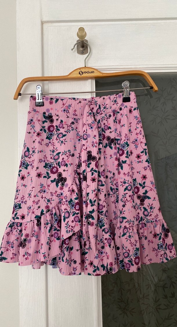 Pembe çiçek desenli, bağlamalı ve fırfırlı etek, bol kesimiyle bohem tarz sunar. Günlük kullanım için uygundur. defosu yoktur