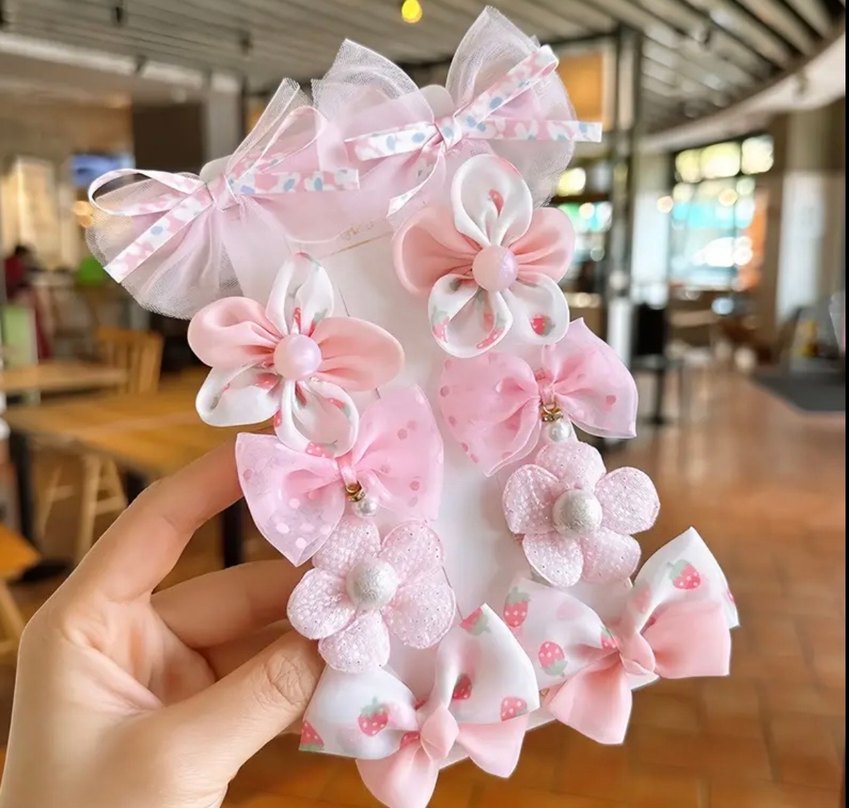 Pastel pembe renkte, çiçek ve fiyonk detaylı çocuk saç tokaları seti.