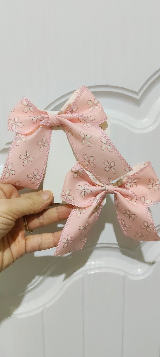 Pastel pembesi çiçek desenli, fiyonk detaylı saç tokaları. Bohem tarzda, yumuşak ve nostaljik bir görünüm sağlar.