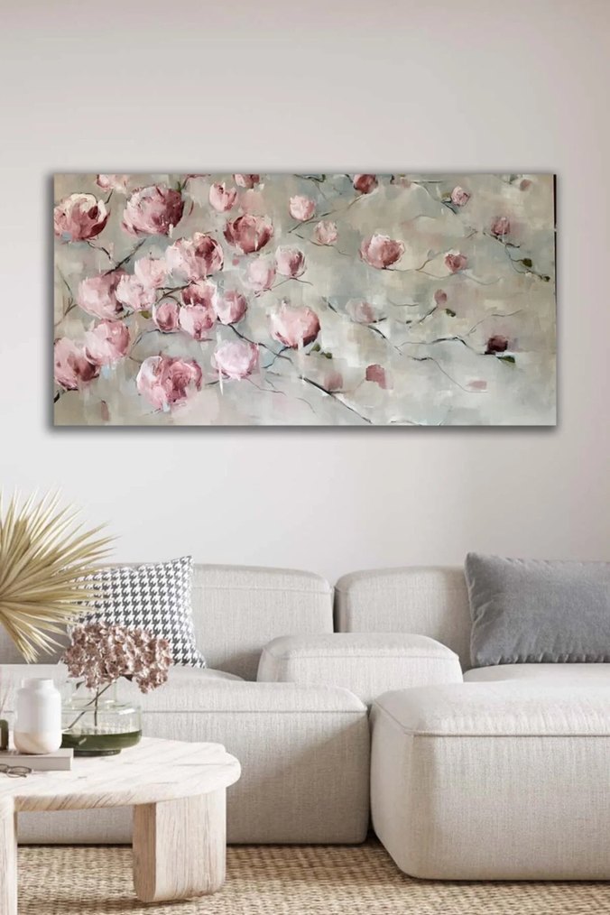 Gri ve beyaz zemin üzerinde pembe çiçekler bulunan, mekana yumuşak ve zarif bir dokunuş katan duvar tablosu. Vivense yağlı boya görünümlü gül kurusu güller Kanvas Tablo. Yepyeni . Aldıktan sonra odamızın dekoruna uyduramadığımız için kullanamadık. #soyuttablo #dekorasyontablo #güldesenlitablo #bordotablo #gritablo #çiçeklitablo #minimalisttablo