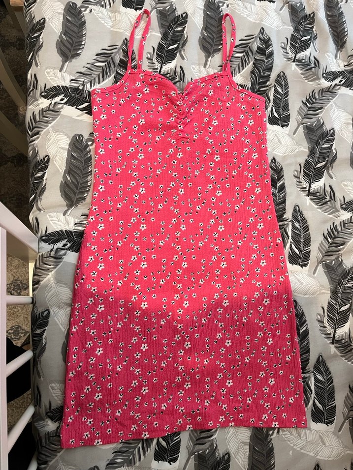Renkli pembe kumaş üzerine küçük çiçek desenleri ve dantel detayları bulunan, ince askılı ve vücuda oturan bohem tarzda kız elbisesi.