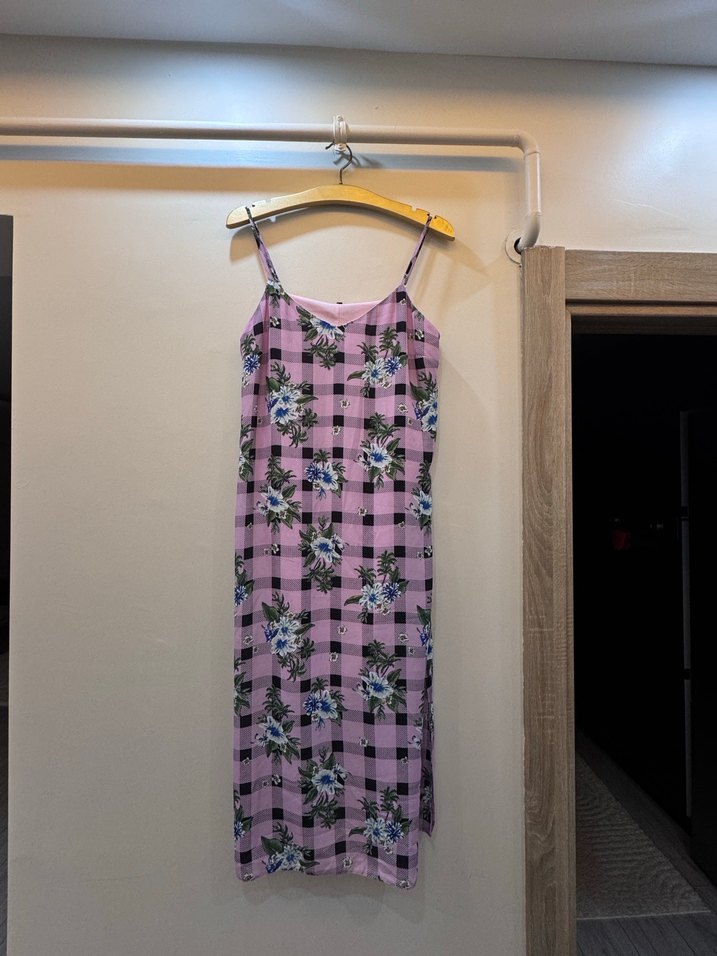 Pembe, ince askılı, çiçek desenli ve kareli desenli uzun elbise. Yumuşak sentetik kumaştan, pileli ve straplez yakalı, bohem ve retro tarzda.