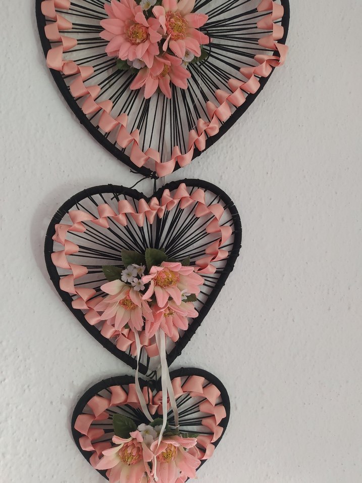 Pembe çiçekler ve kurdelelerle süslenmiş, üç kalp şeklinde çerçeveden oluşan renkli duvar dekoru.