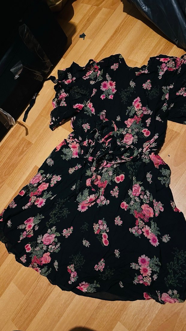 Uzun, bol kesim elbise, koyu pembe çiçek deseni, fırfır detaylı ve V yakalıdır. Askılı kollu, bohem tarzda ve ipek şifon kumaştandır. Romantik akşamlar için uygundur Sırt v yaka fermuar deray boyundan ve belinden kendi kunalundan bağlamalı