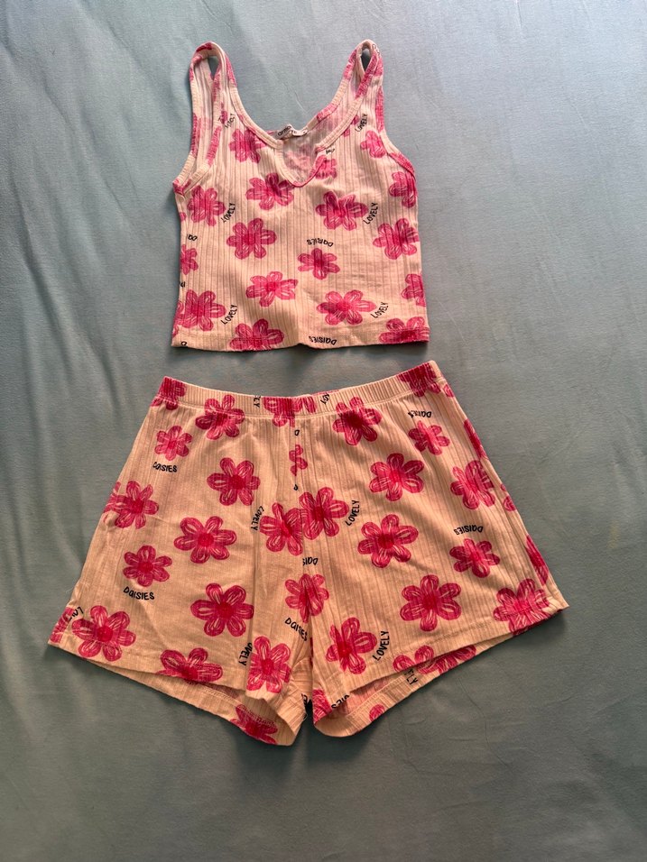 Pembe pastel tonlarında, çiçek desenli, kısa ve salaş kesim kadın pijama takımı, kolsuz üst ve şort ile rahat bir uyku sağlar.