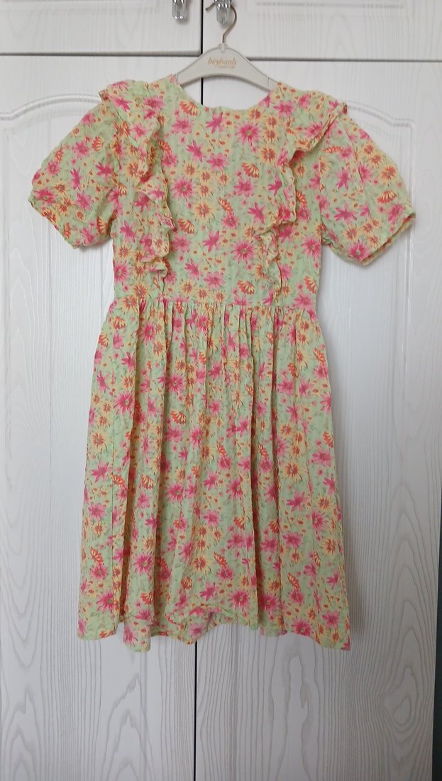 Kısa kollu, yuvarlak yaka ve bol kesime sahip pembe çiçekli bohem kız elbisesi, yumuşak sentetik kumaştan, fırfır detaylıdır.