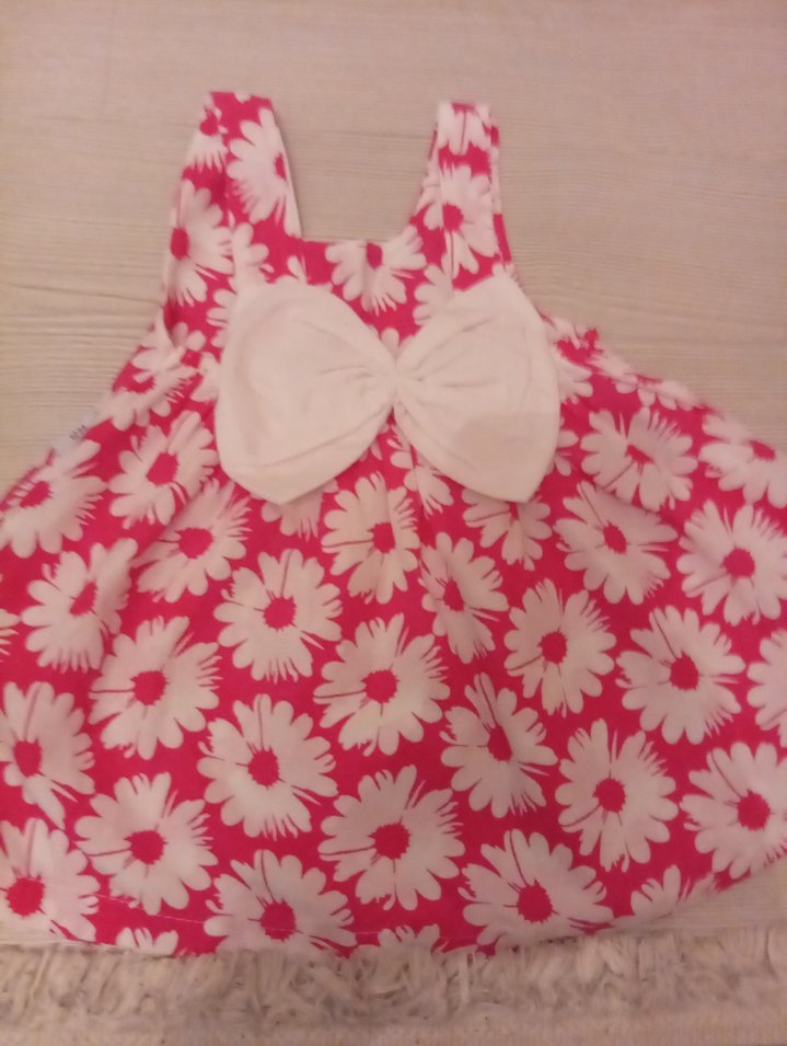 Pembe çiçek desenli, askısız ve önünde büyük fiyonk bulunan kız çocuk elbisesi. Vücuda oturan kesimi ve bohem tarzıyla dikkat çeker.