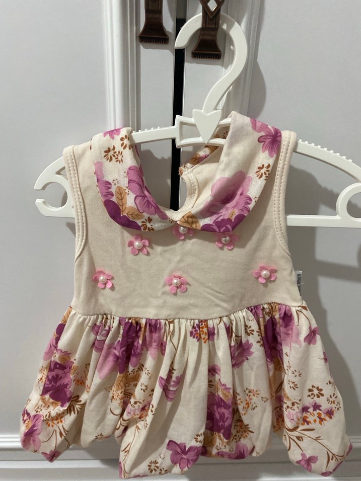 Kolsuz, yakalı ve fırfırlı detaylı pembe elbise. Gevşek kesim, pastel tonlarda bohem çiçek desenli, yumuşak kumaştan yapılmıştır.