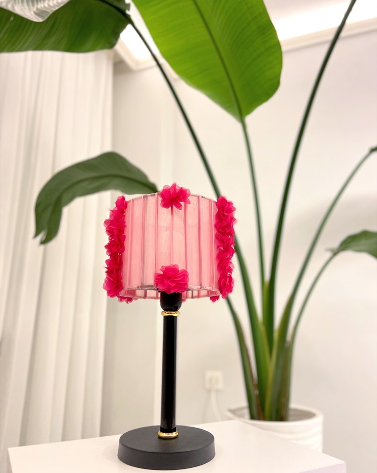 Pembe renkte, çiçek detaylarıyla süslenmiş abajurlu masa lambası, siyah tabanlı.