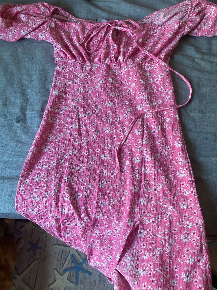 Pembe midi elbise, oturan kesim, drapeli detaylı ve askısız yaka. Yumuşak sentetik kumaştan yapılmış, pastel tonlarda batik desenli bohem tarzı.