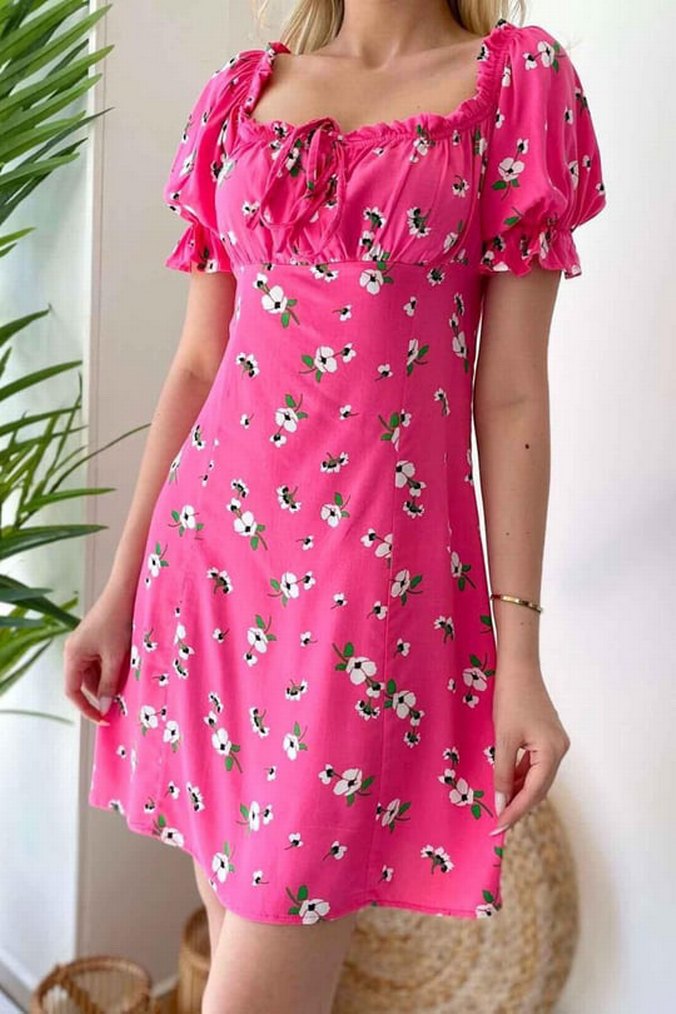 Pembe midi elbise, straplez yaka ve balon kollu bol kesimdir. Yumuşak sentetik kumaştan, renkli çiçek deseni ve drapeli bohem tarzda tasarlanmıştır.