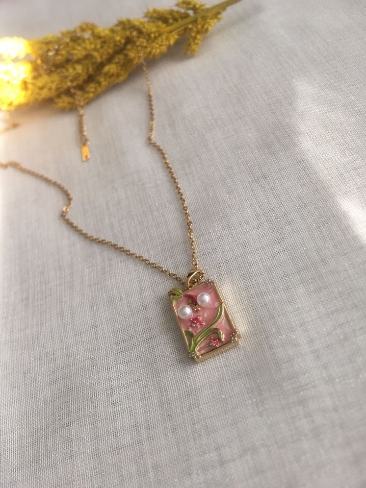 Detaylı zincirli, pastel pembe çiçek desenli ve inci süslemeli midi uzunlukta bohem tarzda kolye, romantik akşamlar için uygun. Çelik kolye 40 cm ölcüsü