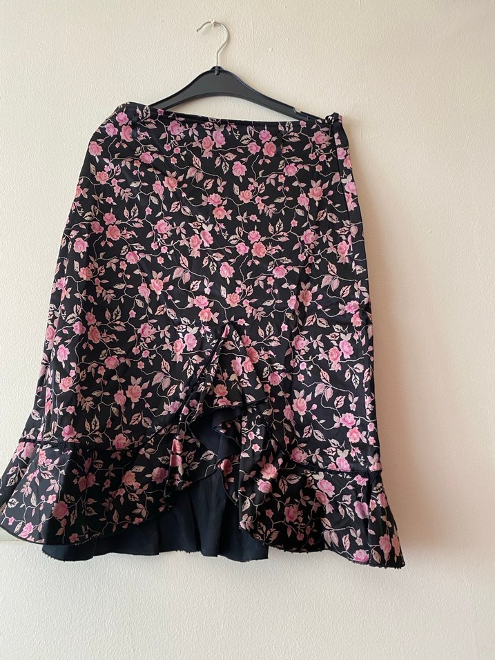 Gevşek kesim, pembe çiçek desenli koyu renk midi hamile eteği, etek ucu fırfırlı, günlük kullanım için goth bohem tarzda.