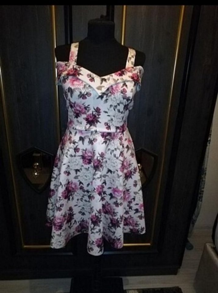 Suni kumaştan yapılmış, dantel detaylı, askılı straplez yaka ve çiçek desenli, vücuda oturan mini bohem elbise. Düğünler ve vintage tarz için uygundur.
