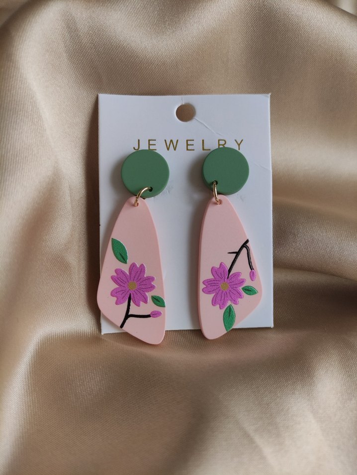 Pastel pembe, çiçek desenli ve boncuk detaylı, minimalist ve bohem tarzda kısa uzunlukta kadın küpe. Günlük kullanım için uygundur.