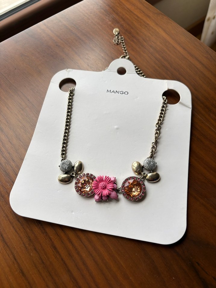 Pembe çiçek detaylı, renkli boncuklu mini kolye. Vintage bohem tarzıyla romantik akşamlar için uygun. Marka: Mango.