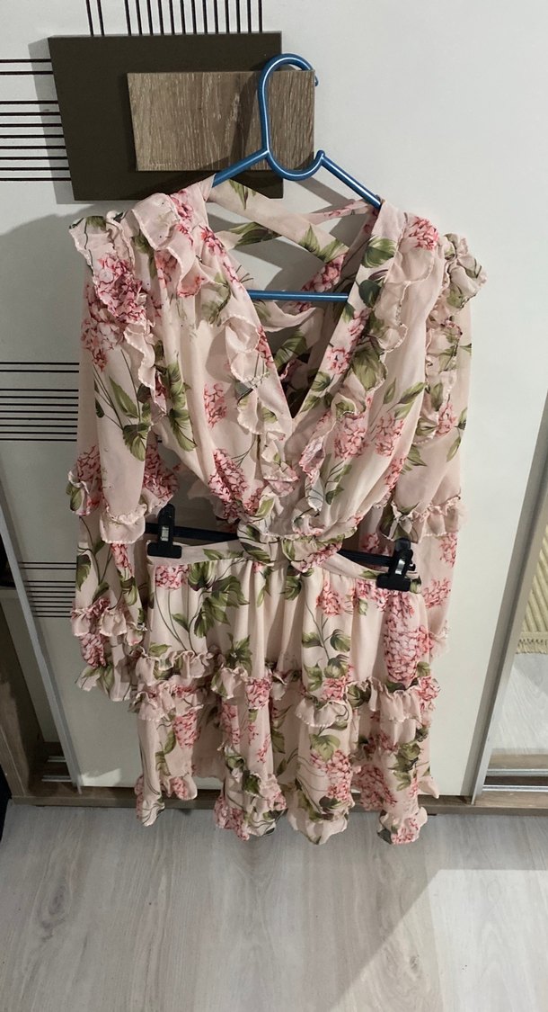 Bu açık pembe mini elbise, çiçek desenleri ve fırfır detayları ile bol kesime sahiptir. V yakalı ve askılı kolludur, günlük kullanım için uygundur.