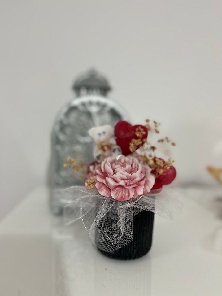 Küçük ayıcık ve kırmızı kalp süslemeli, beyaz tül detaylı siyah vazosu çiçekli mumlar.