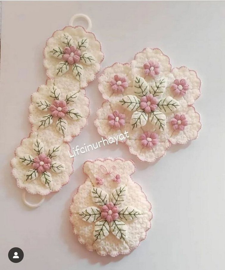 Yumuşak dokulu zeminde pembe nakışlı çiçek desenleri bulunan el yapımı set. Farklı şekillerde çiçek motifleri içerir.