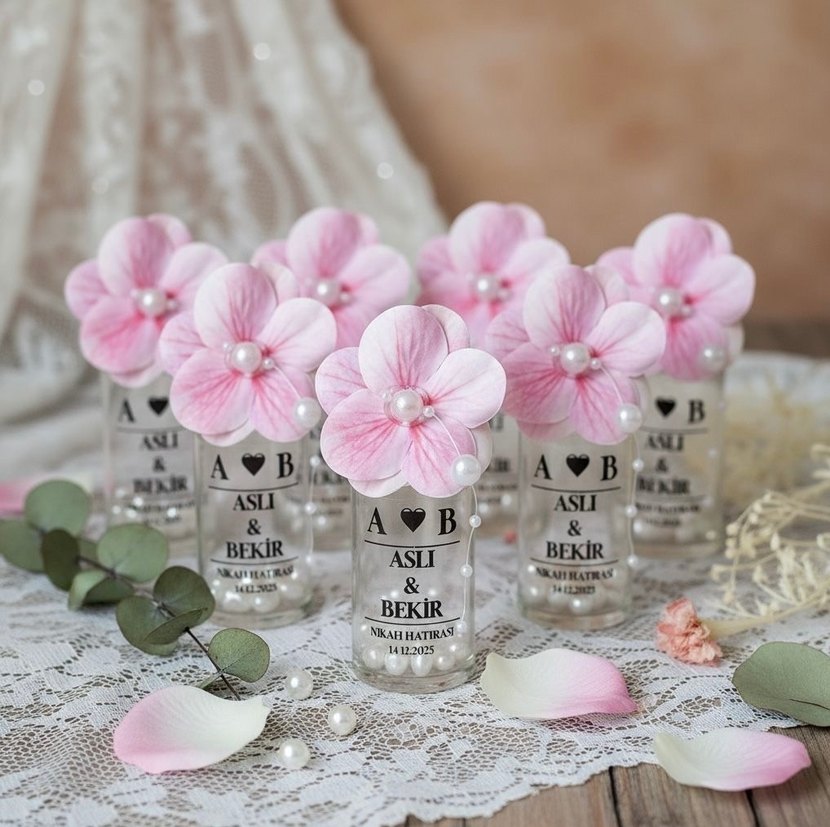 Üzerinde isim ve tarih yazılı, pembe çiçek süslemeli cam şişeler, nikah hatırası olarak kullanılabilir.